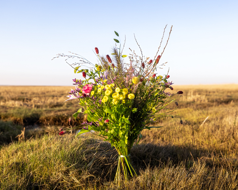 En vild buket i pink og gule nuancer – sprudlende, farverig og fuld af liv.